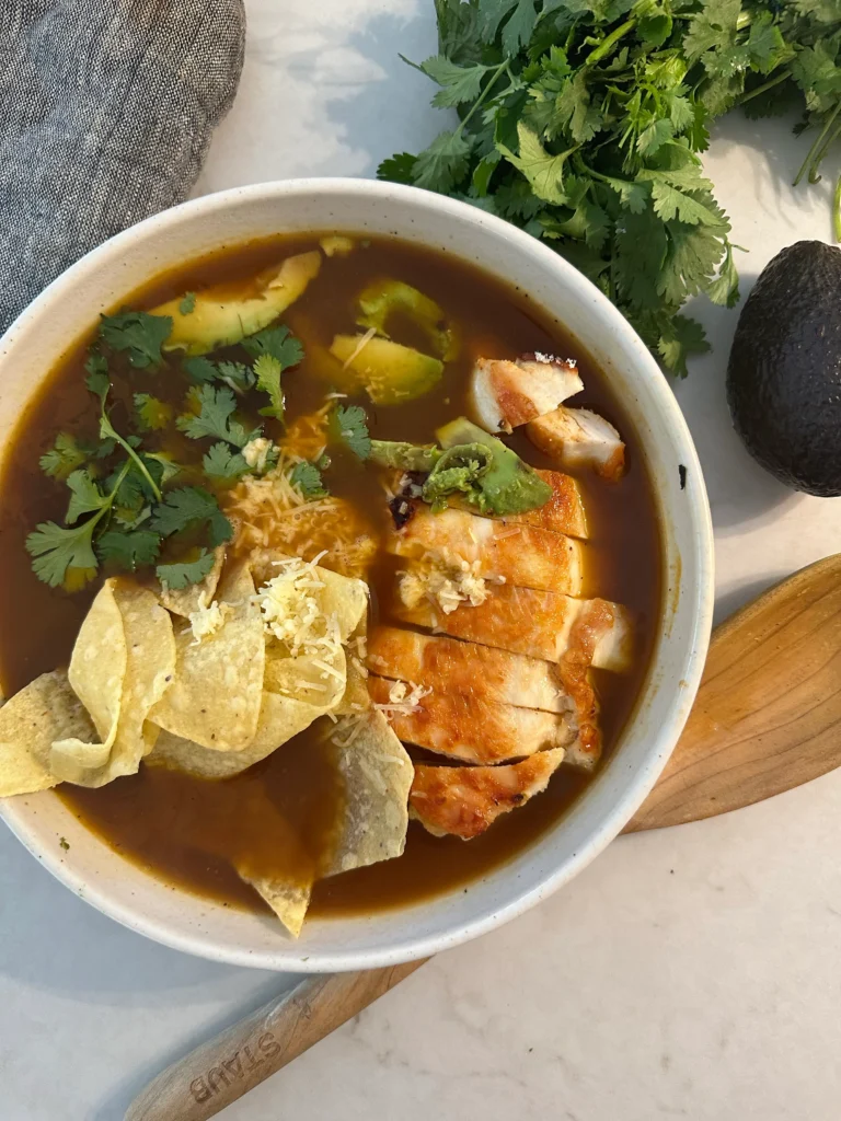- Add to bowl, top with avocado, sliced chicken, cilantro, chips, cheese. Enjoy!