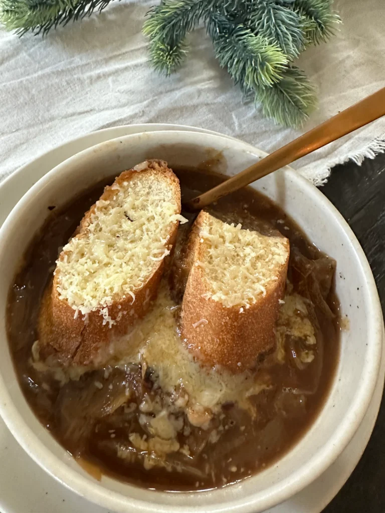 - Pour into oven safe bowls (or you can add baguettes to top of large pot and broil directly in pot). Add baguette slices to the top, top with cheese, and stick under broiler for 3-4 mins until cheese is melted and bubbly.
