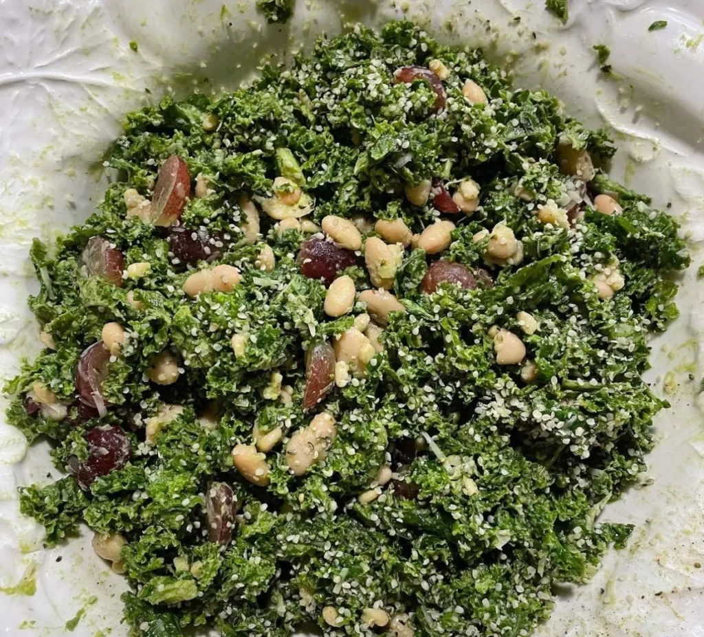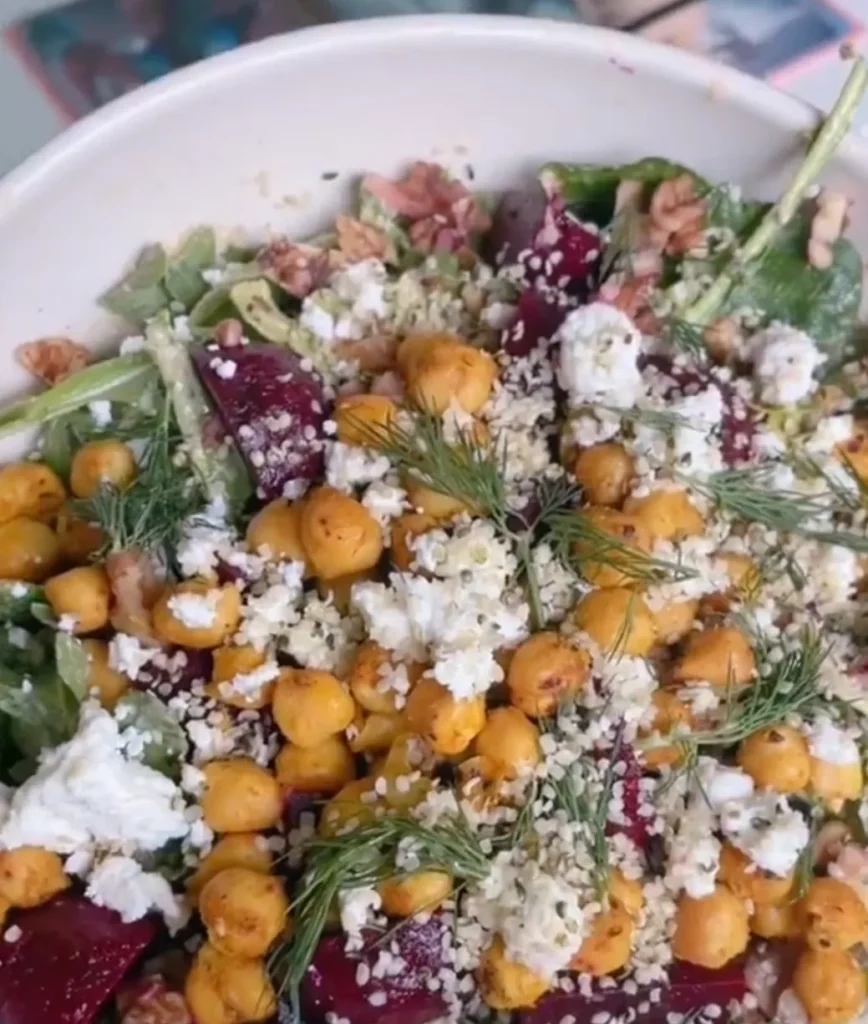 🥗 top with half the chickpeas, 1 oz crumbled goat cheese, 2 tbsp chopped walnuts, sprinkle of dill (optional), and sprinkle a few tbsp of hemp seeds.