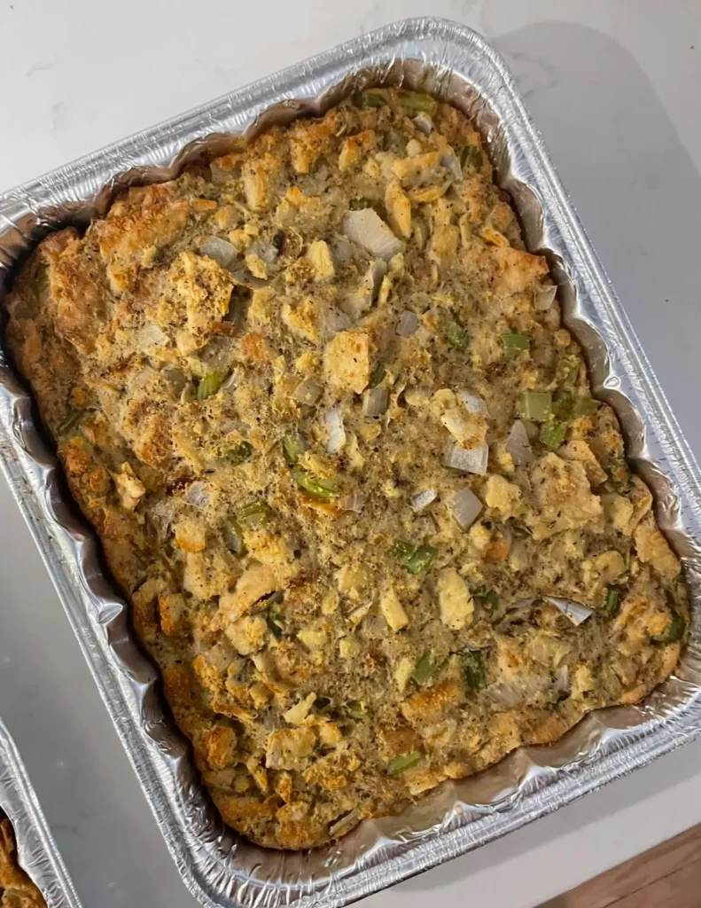 🧄 boil 1 big box of stock/broth + water and garlic powder, onion powder, sage and tarragon in large pot. I filled up the liquid about 1/3 way up. Don’t overfill it – once the potatoes are in, it will get super high. I like using part stock for more flavor but this is optional. For vegan – use veggie stock. Otherwise, I used chicken.