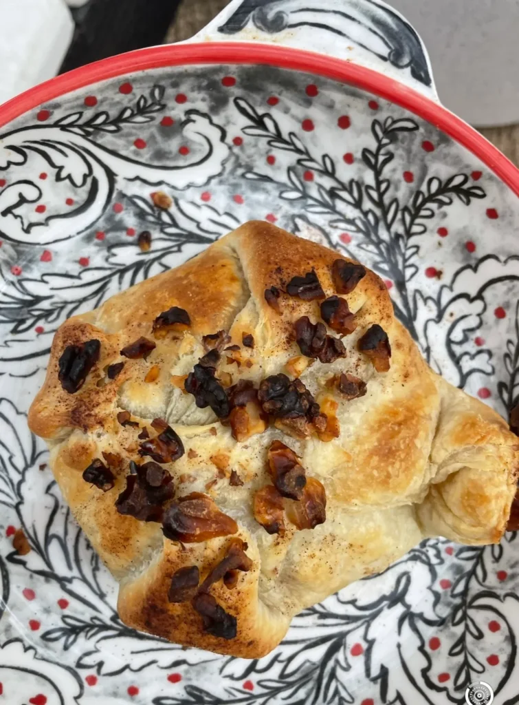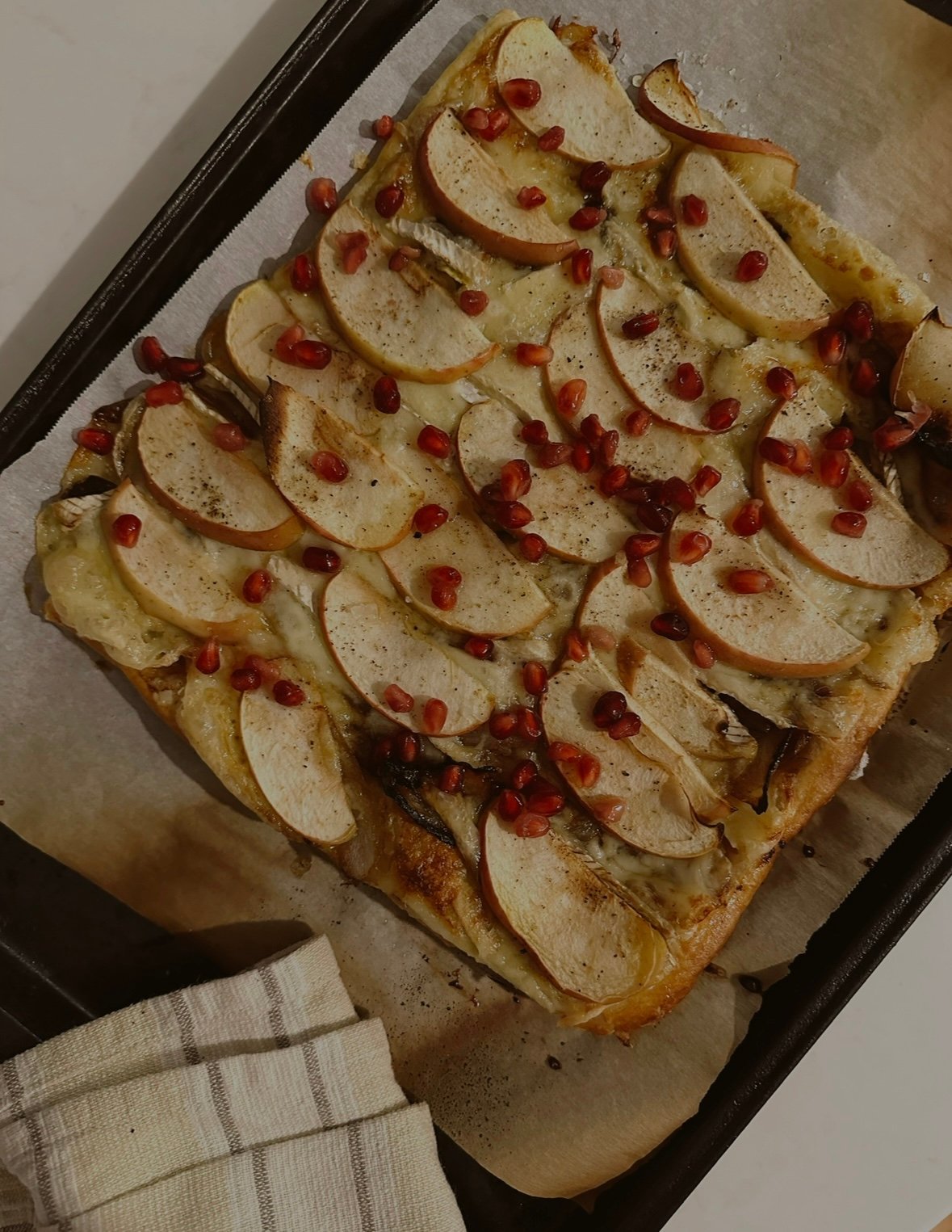 - Unfold puff pastry, add Brie in the middle, top with apple, drizzle with honey, sprinkle pumpkin pie spice, top with 1 tbsp of walnuts.