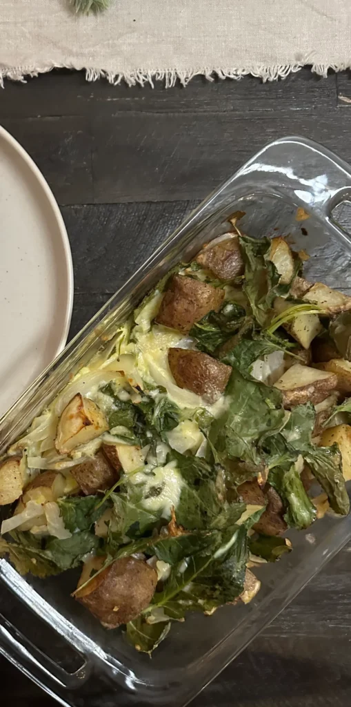 🥗 3 cups of greens – I used 1.5 cups arugula and 1.5 cups baby spinach & baby kale mix. toss in dressing.