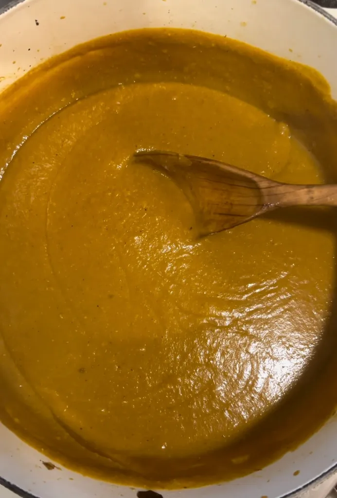 - Blend – either let cool slightly and add batches to blender to purée. Or I used my hand blender in the pot.