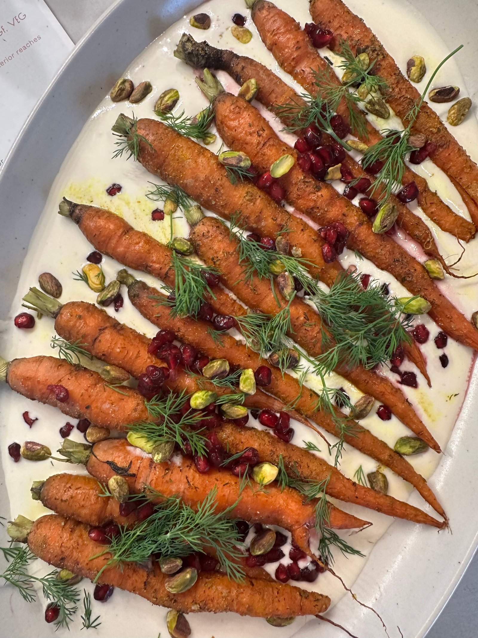5. Spread whipped feta on serving platter, top with carrots, pomegranate, pistachios, drizzle of hot honey, & fresh dill.