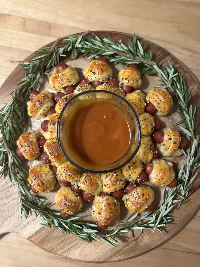 3. Line a cookie sheet with parchment paper. Place the sauce bowl you’re going to use in the center. Place each pigs in a blanket around the bowl, each should be touching. Then do the next layer around it to form a wreath (see photo).