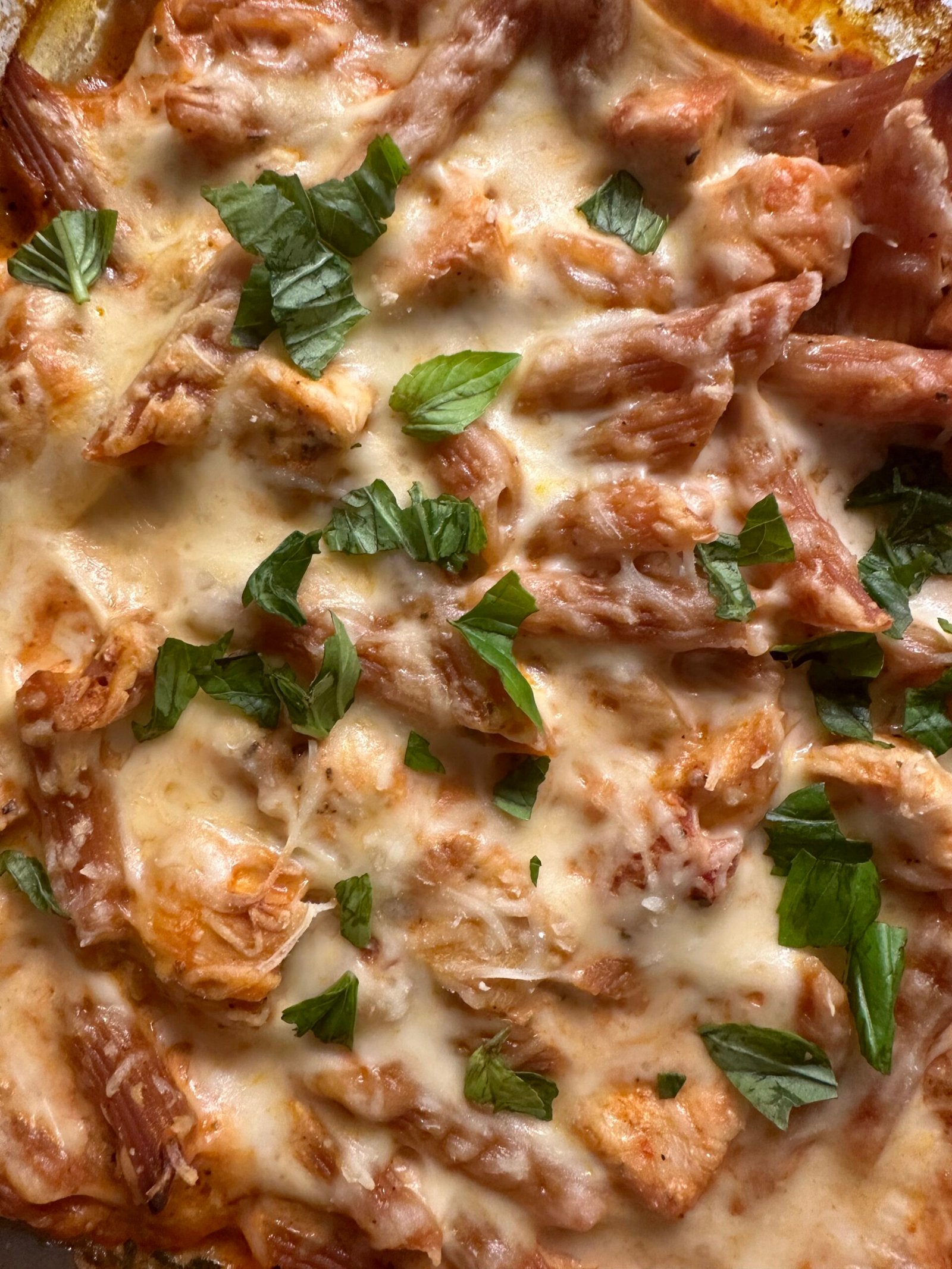 6. In square baking dish add pasta, chicken (& optional veggies), marinara & cottage cheese and mix well. Top with mozzarella and bake ~15-20 mins. Option to cook for less time and just pop the broiler on for 3ish mins to make a nice cheesy crust on top. I’ll shorten the cooking time to 10 mins plus 3 mins broiler in that case – esp if I’m short on time during the week!