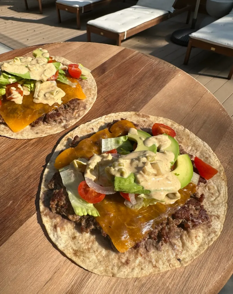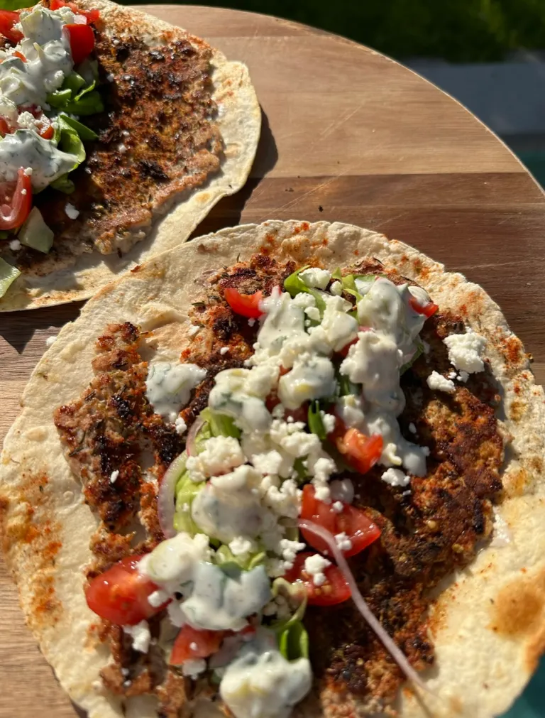 - Pat ground meat into a thin layer on to each tortilla. Season with gyro seasoning. Sear on skillet/flat top for 4ish mins, then flip and let other side crisp up for about 3-4 mins.