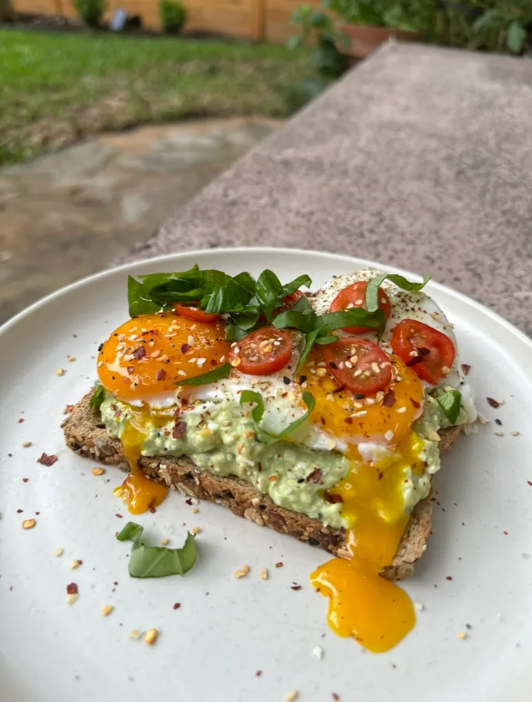 Top toast with Avo & cottage cheese mixture, eggs, tomato, crushed red pepper/chili crunch & EBTB seasoning and top with micro arugula.