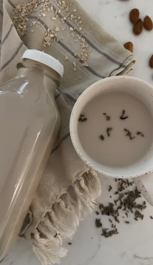 - Pour almonds, oats, lavender & 2 dates into a bowl, and pour hot water over it to cover (about 2 cups). Let sit 1-2 hours. Could also use cold water and soak overnight.
