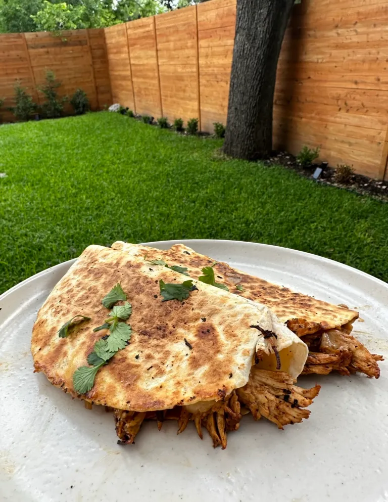 - Rub tortilla on both sides in the chicken mixture to season it. Add to skillet, top with cheese, add chicken on one side (about 2 tbsp cheese & 3-4 tbsp of chicken). Fold tortilla over and press down with spatula. Let cook 2-3 mins til crispy, flip, cook 2-3 mins, remove. I did two in a pan at once – once the first taco was folded over, added the other tortilla, cheese, chicken & then folded over.