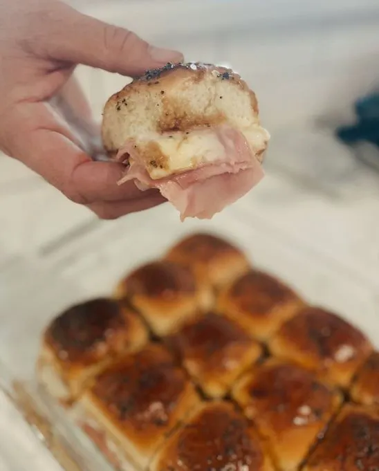 - Place bottom halves of rolls, add ham + cheese, then tops.