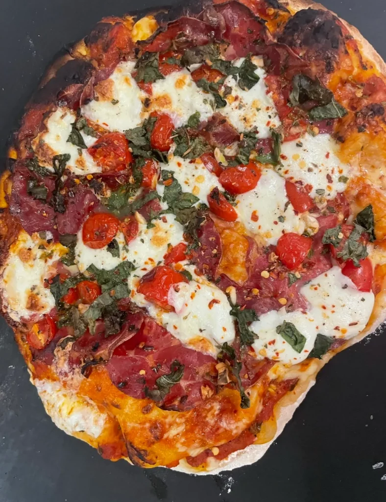 4. Bake 20-25 mins until golden brown and puffed up. Drizzle with hot honey or honey + crushed red pepper, and sprinkle pomegranate seeds. Slice & enjoy!