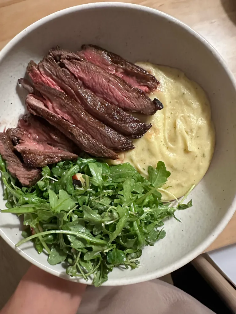 2. heat cast iron pan on high heat with a high heat oil – I used avocado oil. Pop steak on and let sear, don’t move it, for a few minutes until a nice crust has formed.