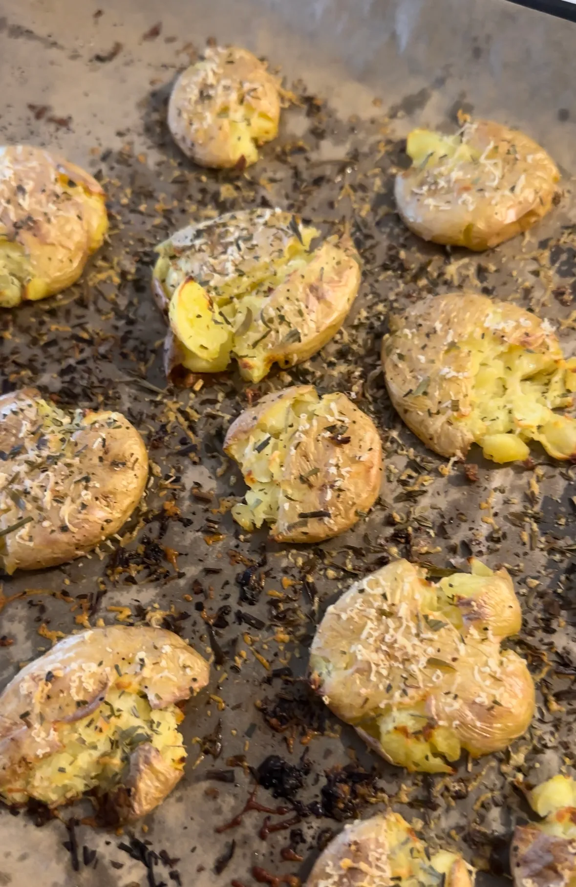 3. Remove from oven. Use mason jar or coffee mug to smash each potato. Sprinkle with parm & herbs.