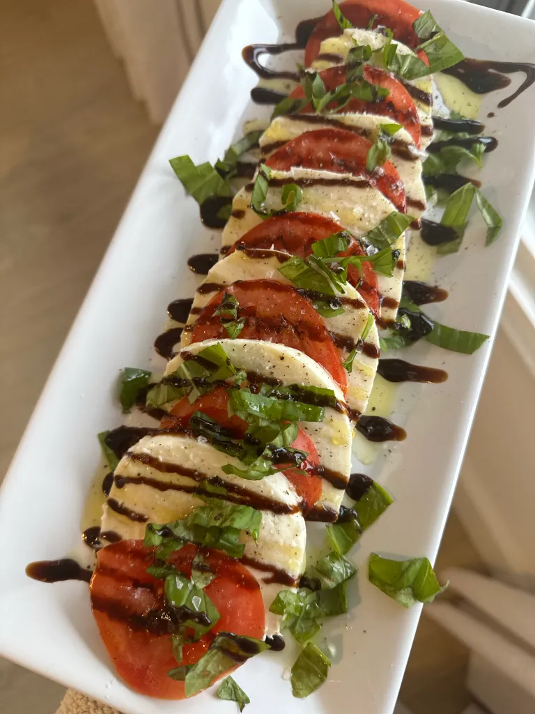 3. Arrange mozzarella & tomatoes on plate, tomato then slice of mozz, tomato then slice of mozz etc etc