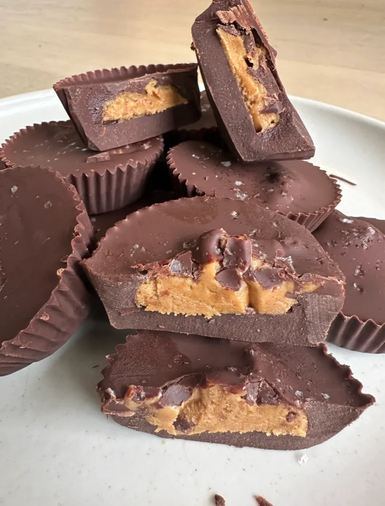 5. Remove from freezer. Add 1/2-1 tbsp of peanut butter mixture to each liner. Top with remaining chocolate in each cup. Sprinkle with a little flakey salt.