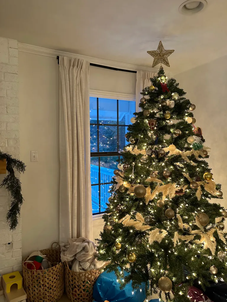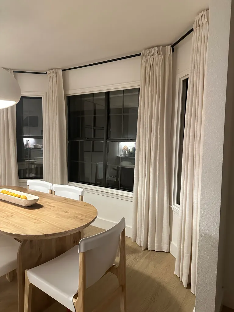 2. Order your rod first – you need to know the exact length of the curtain either from the bottom of the rod, or from the bottom of the rings. My personal preference is from the rod itself, no rings. So the curtain looks like it is touching the ceiling. My rod took off about 1” from the length of ceiling to floor. Also – I very much prefer a curved edge curtain rod. This means the curtains will be able to wrap all the way around and you won’t have light coming in on the sides. For my bay window – I did 3 of these rods (middle one was a larger size) with these bay window connectors. Way cheaper than a custom rod!