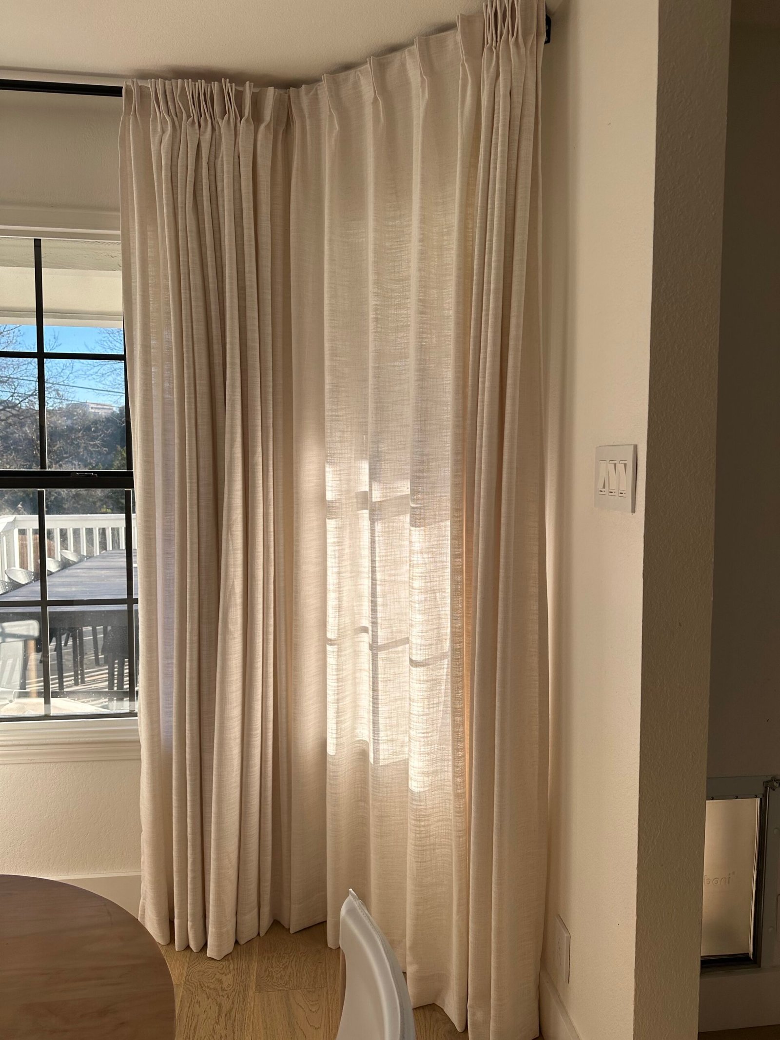 2. Order your rod first – you need to know the exact length of the curtain either from the bottom of the rod, or from the bottom of the rings. My personal preference is from the rod itself, no rings. So the curtain looks like it is touching the ceiling. My rod took off about 1” from the length of ceiling to floor. Also – I very much prefer a curved edge curtain rod. This means the curtains will be able to wrap all the way around and you won’t have light coming in on the sides. For my bay window – I did 3 of these rods (middle one was a larger size) with these bay window connectors. Way cheaper than a custom rod!
