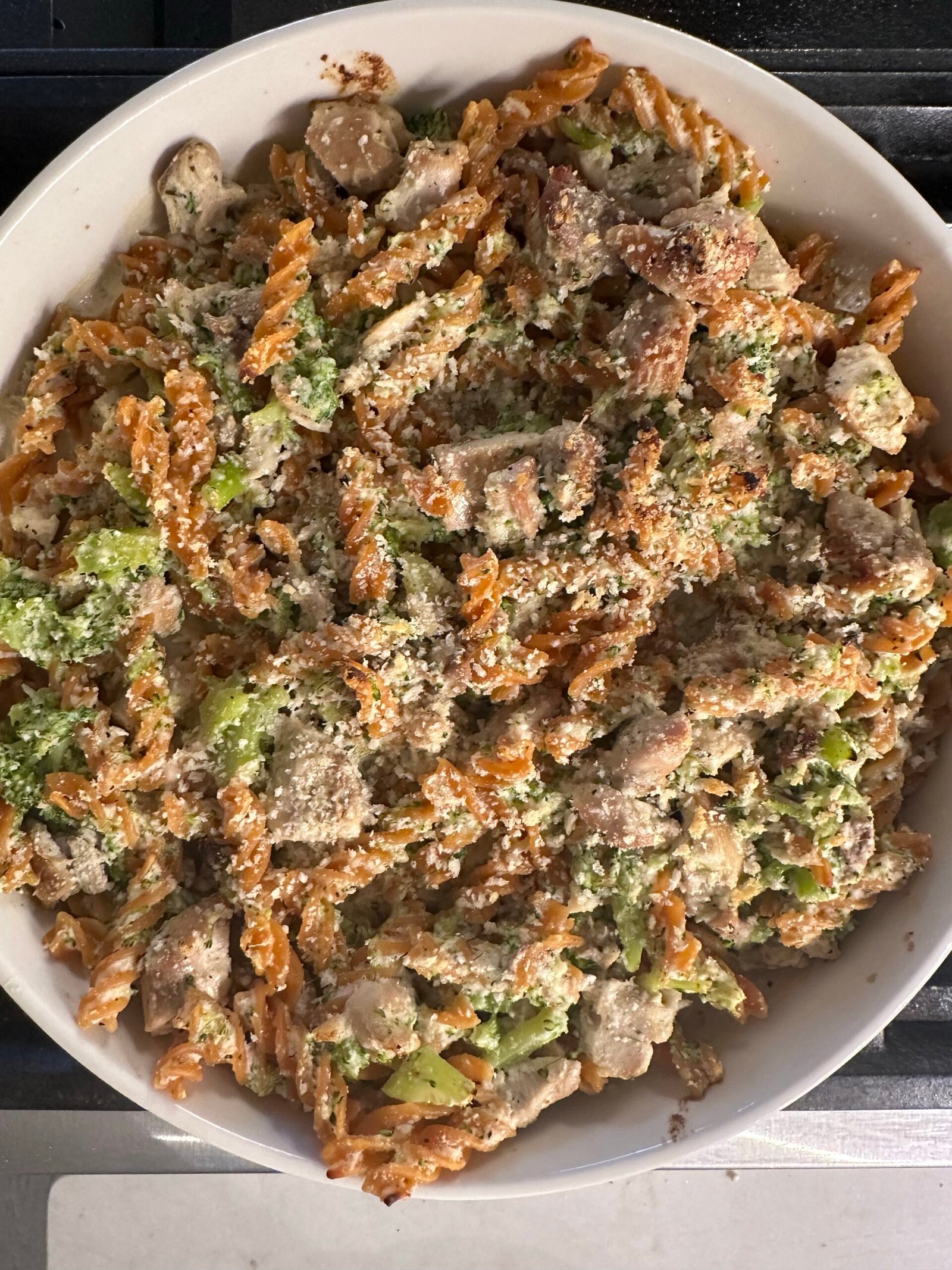 5. Dice chicken. Add pasta & brocolli and chicken to the pot. See how the sauce is, if needed, can slowly add more liquid (milk or pasta water 1 tbsp at a time). Season to taste.