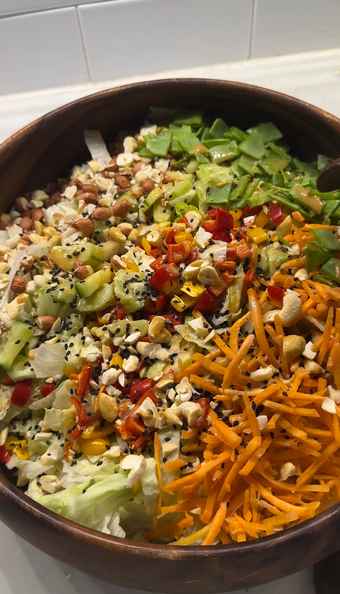 2. Build salad: lettuce, top with carrots, peppers, peanuts, cucumbers, snap peas, chicken, sesame seeds & drizzle with dressing. T