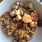 – 5-6 oz diced cooked chicken breast (recipe below – 1 tsp olive oil or avocado oil, salt, pepper, garlic powder, ginger powder)