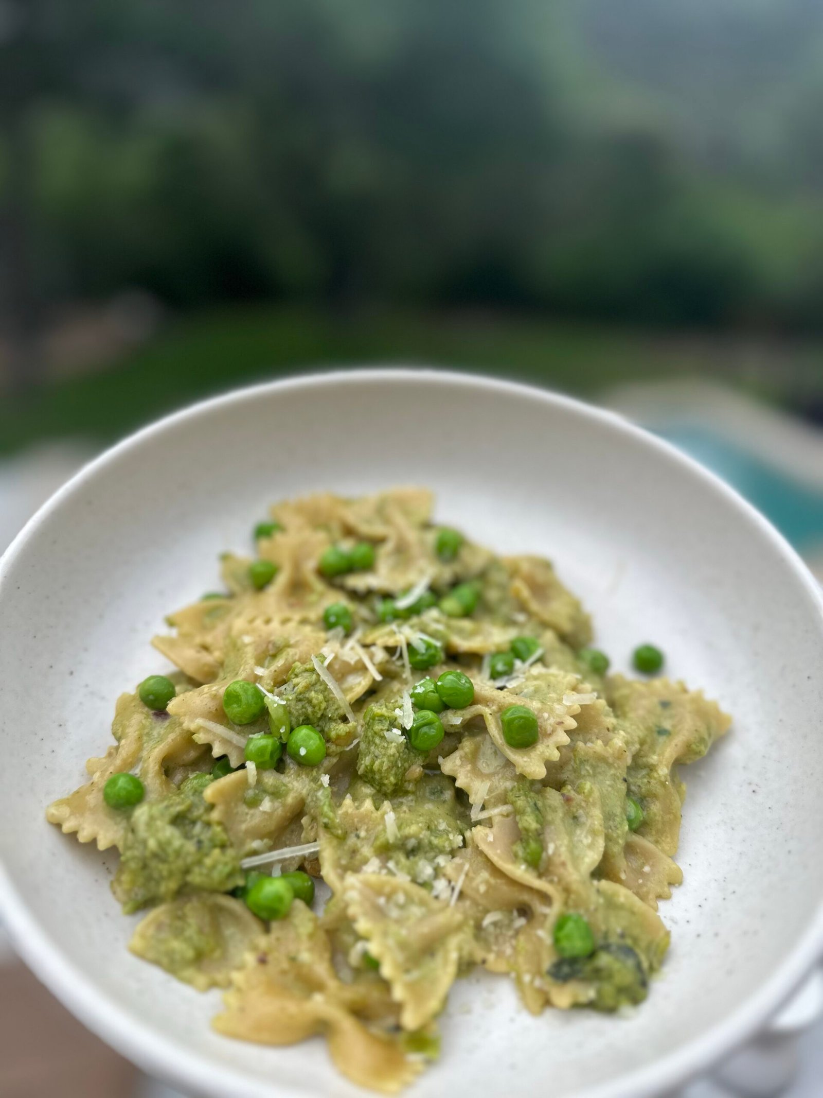 4. In same skillet peas cooked in over medium heat, add your pasta, 3 tbsp pesto, and 1/2 cup of pasta water. Can add more if needed. Mix well. Add 2 tbsp parm. Let the liquid cook down a bit, about 3-4 mins. Add remaining parm, top with remaining pesto and serve.