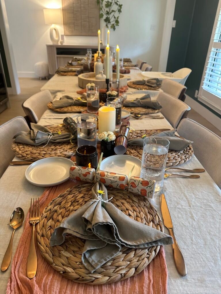Table decor can elevate the holiday experience, making the meal feel even more special. Whether you want something elegant or simple, places like World Market, Dollar Tree, and Amazon offer affordable options. Consider using cute table centerpieces, autumnal-themed napkins, and even name cards for a personalized touch. If you’re hosting Friendsgiving, disposable plates are convenient, but for Thanksgiving, nicer plates may add to the occasion.