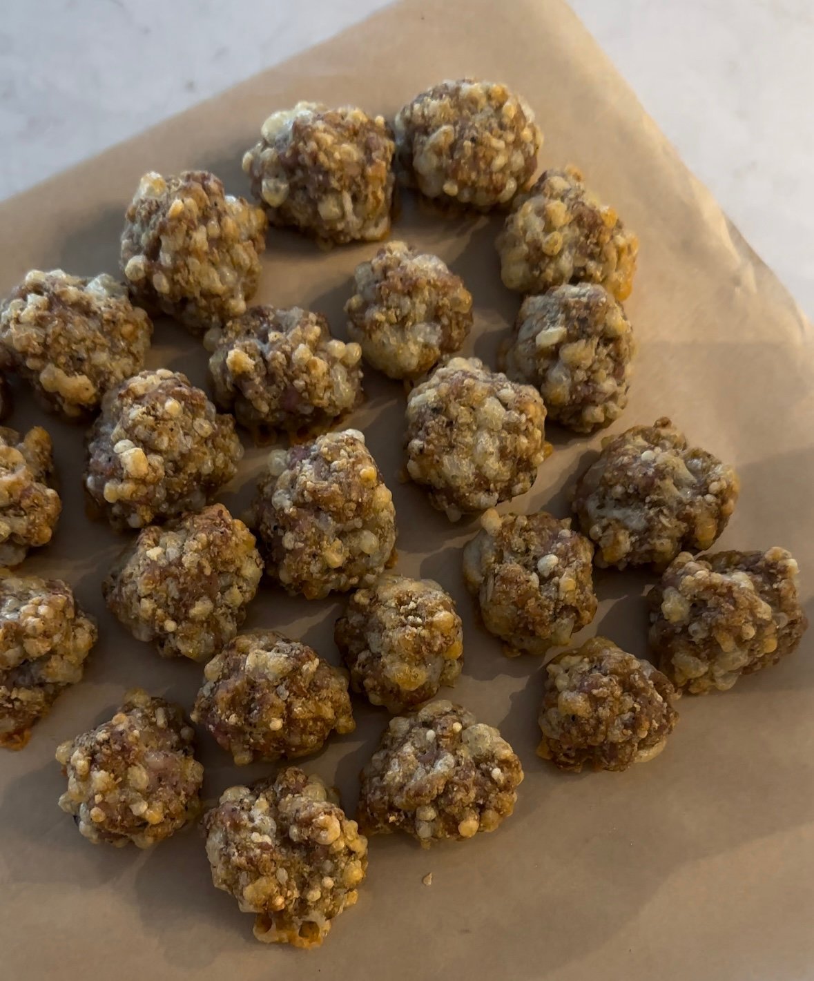- Cool & Store: Let the sausage balls cool. Store in layers using parchment paper in a large freezer bag or glass container.