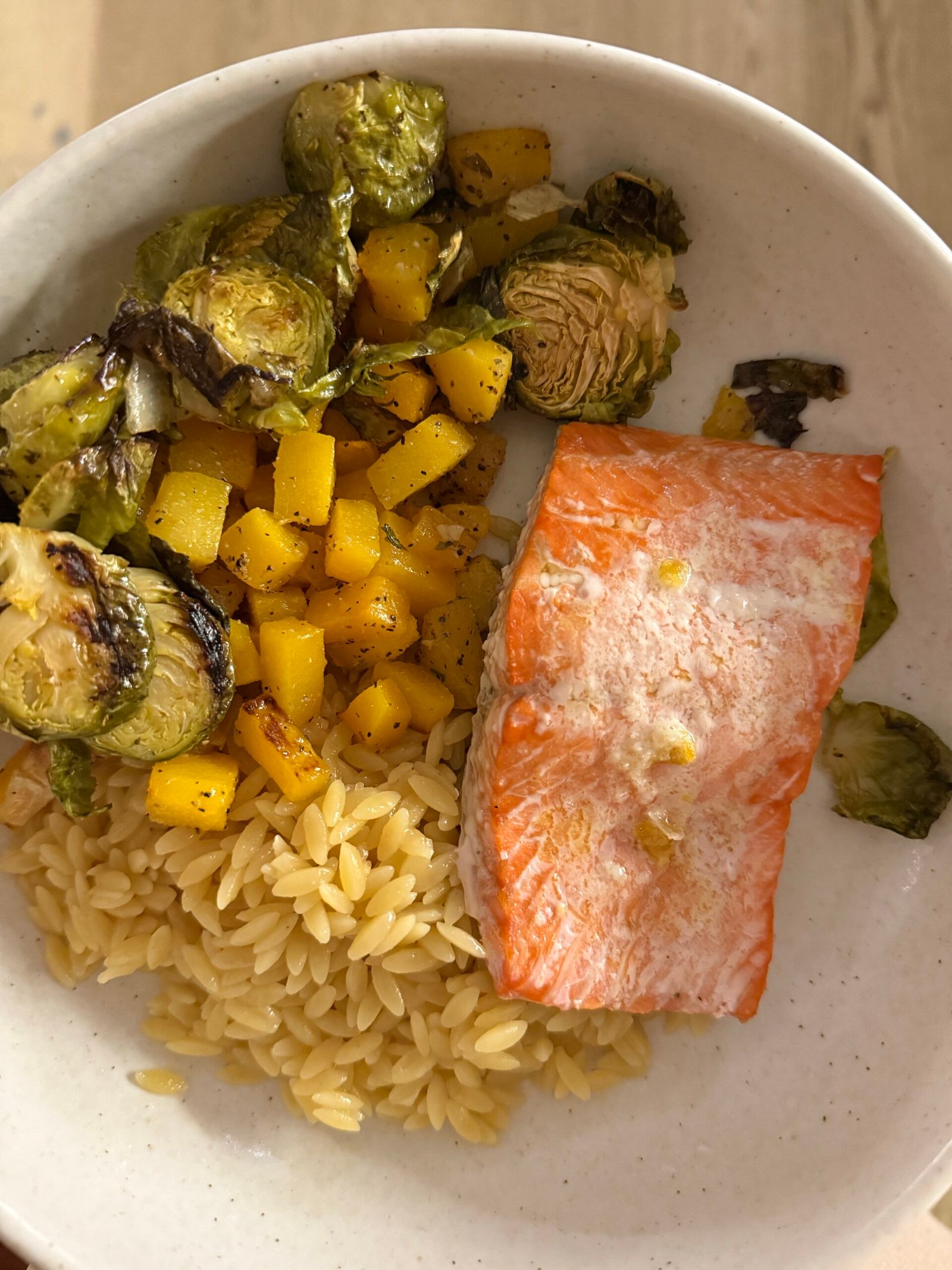 • Toss Brussels & butternut squash with beef tallow, olive oil, salt, pepper, ginger & turmeric.