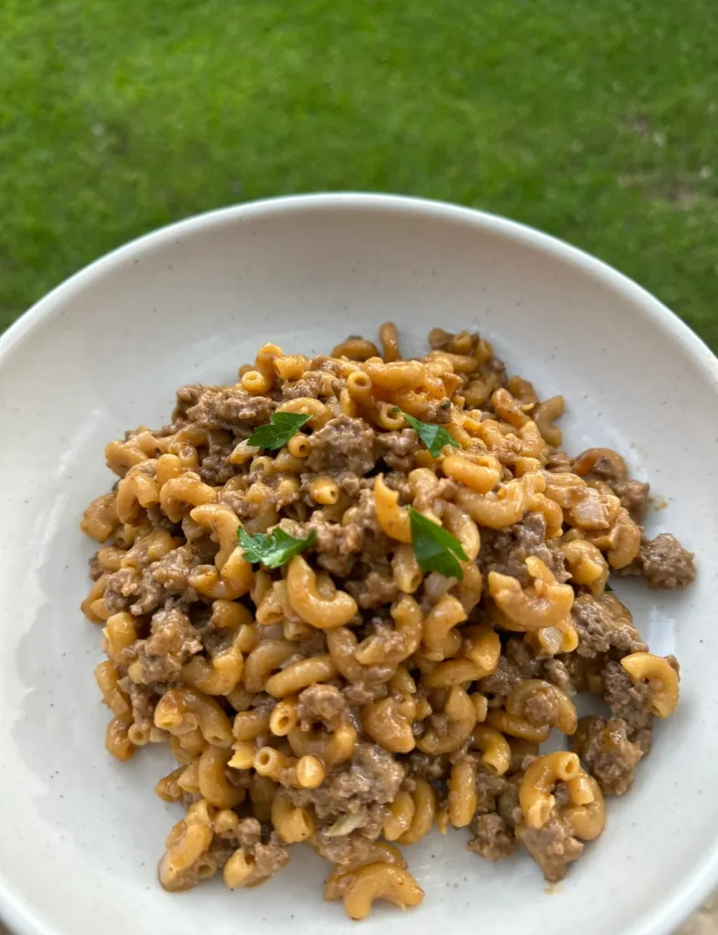 1. Chickpea Cheeseburger Mac + Optional Roasted Parm Green Beans