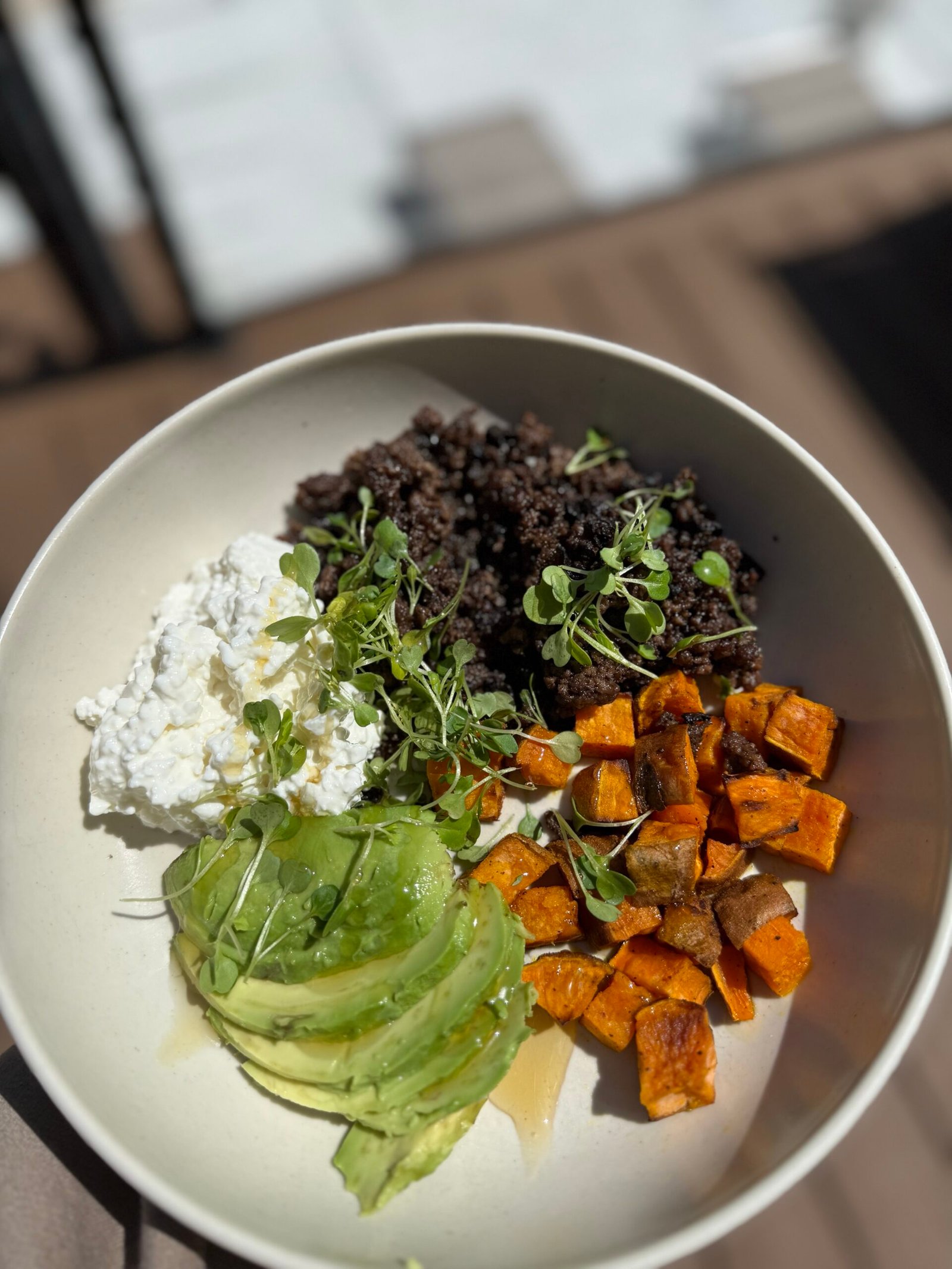 When ready to eat, microwave the beef + sweet potato base for 1.5 minutes. Top with: