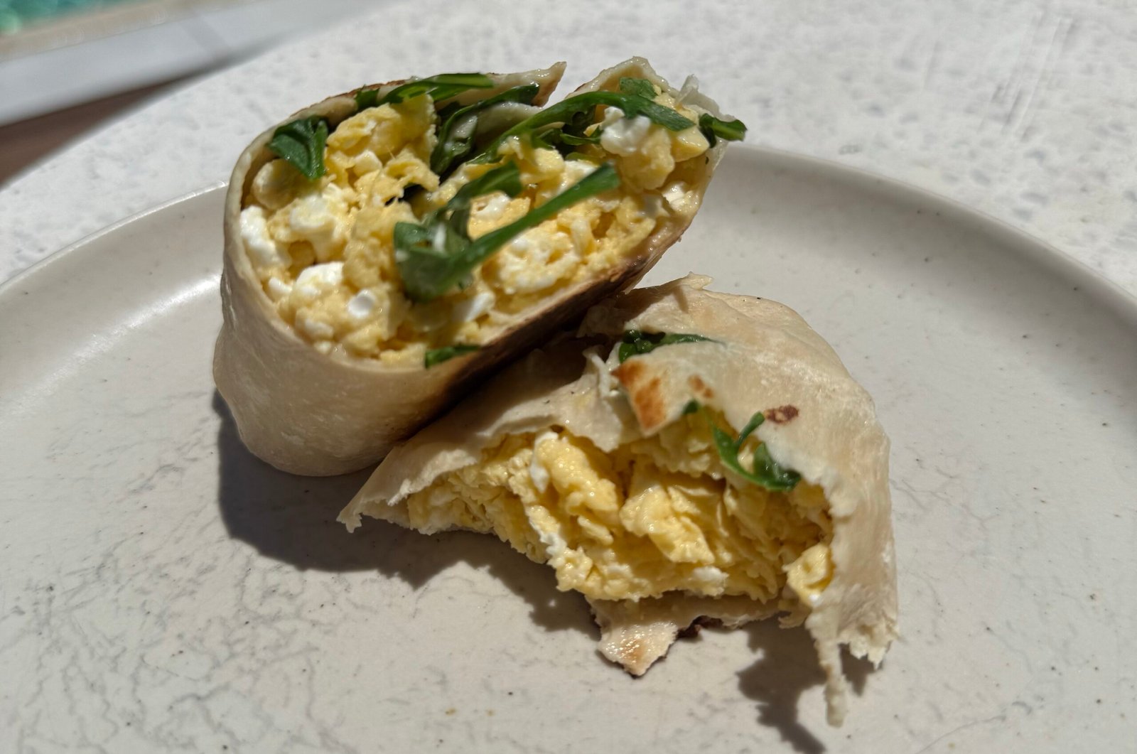 3. Assemble the burrito by layering the scrambled eggs, feta, and arugula in the tortilla.