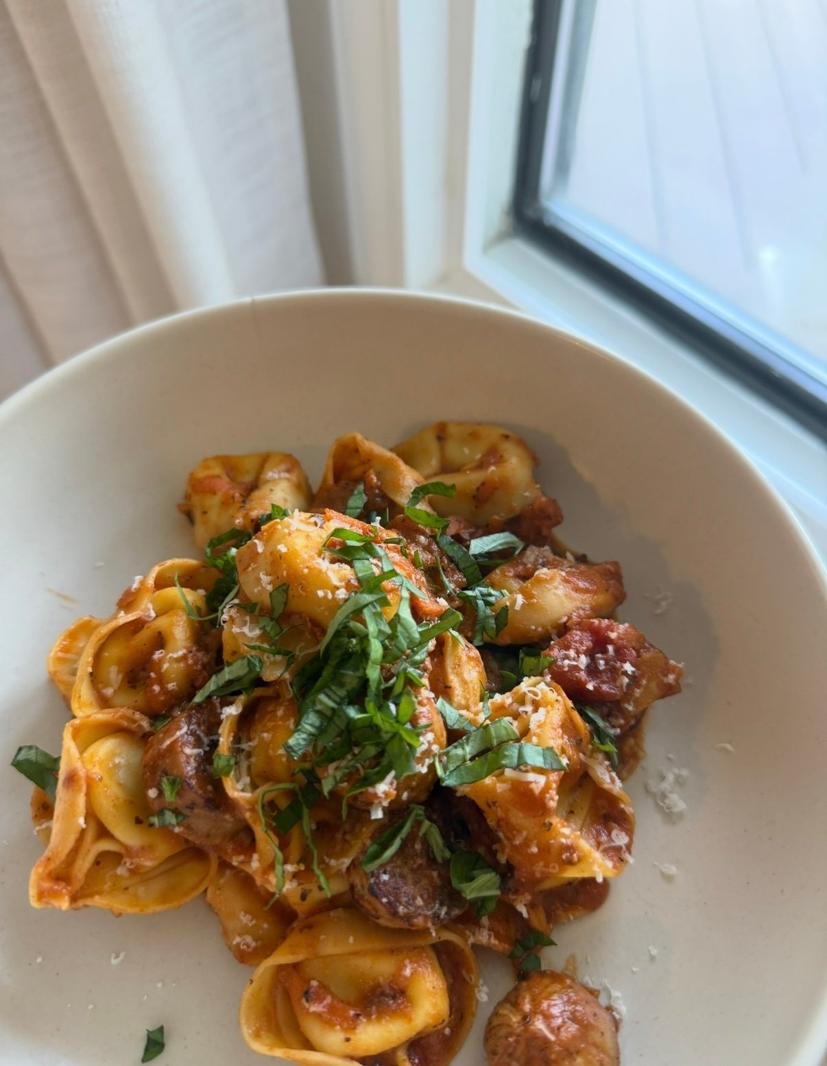 This 20-minute weeknight dinner is sneaky in the best way: packed with veggies, protein, and toddler-approved. I used gluten-free cheese tortellini, my go-to caprese chicken sausage from Blinkski’s, a full cup of shredded carrots (they disappear in the sauce), and Sauz marinara — with just a splash of cream to bring it all together.