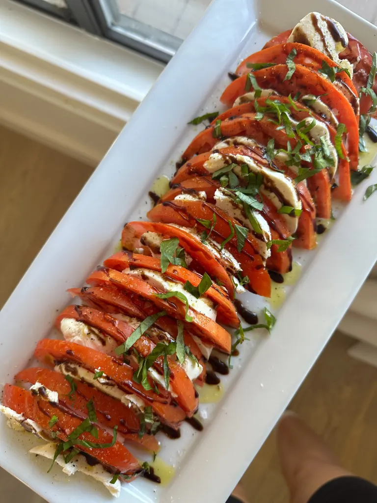 - Ingredients: 3 heirloom tomatoes, 8 oz mozzarella, handful of basil, 1 tbsp olive oil, balsamic glaze