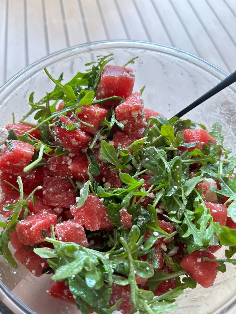 - Ingredients: 2 cups watermelon (cubed), 1/2 cup feta, 1/2 cucumber (sliced), 1 tbsp chopped mint, juice of 1 lime, pinch of sea salt