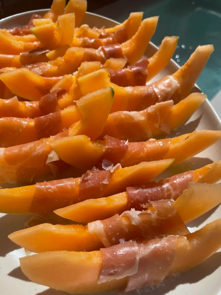 - Ingredients: 1 cantaloupe (cut into slices), 1 pack prosciutto, optional fresh basil, balsamic glaze