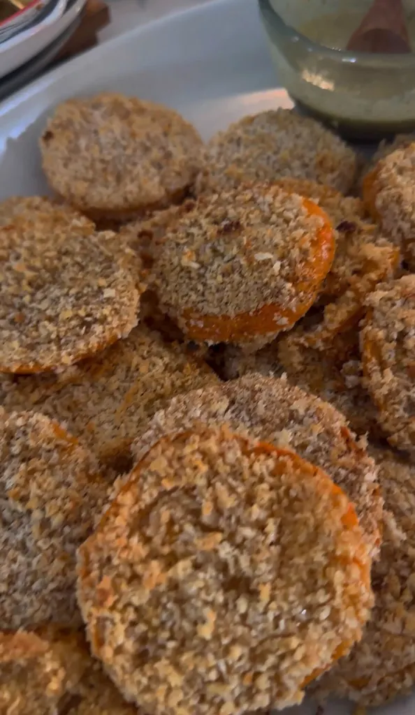 - Instructions: Dip sliced tomatoes in egg, dredge in almond flour + cornmeal mix. Fry in oil over medium heat until golden. Mix yogurt with dill and garlic for dipping.