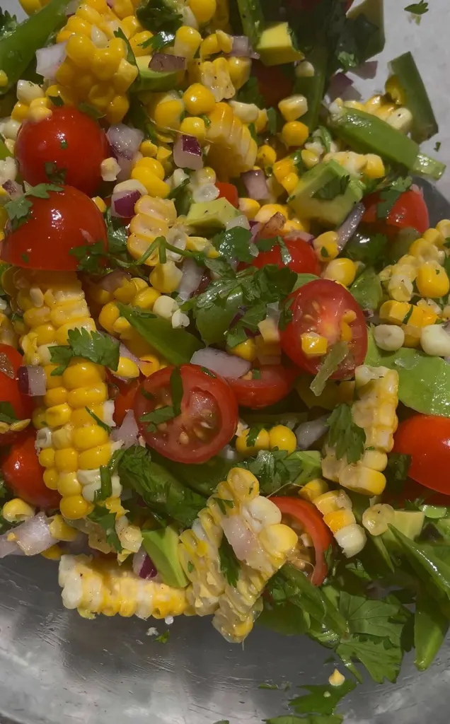 - Ingredients: 2 ears corn (grilled and cut off cob or 1.5 cups canned), 1 avocado (cubed), 1 cup cherry tomatoes (halved), 1/4 red onion (diced), 2 tbsp cilantro, juice of 1 lime, 1/4 cup crumbled feta
