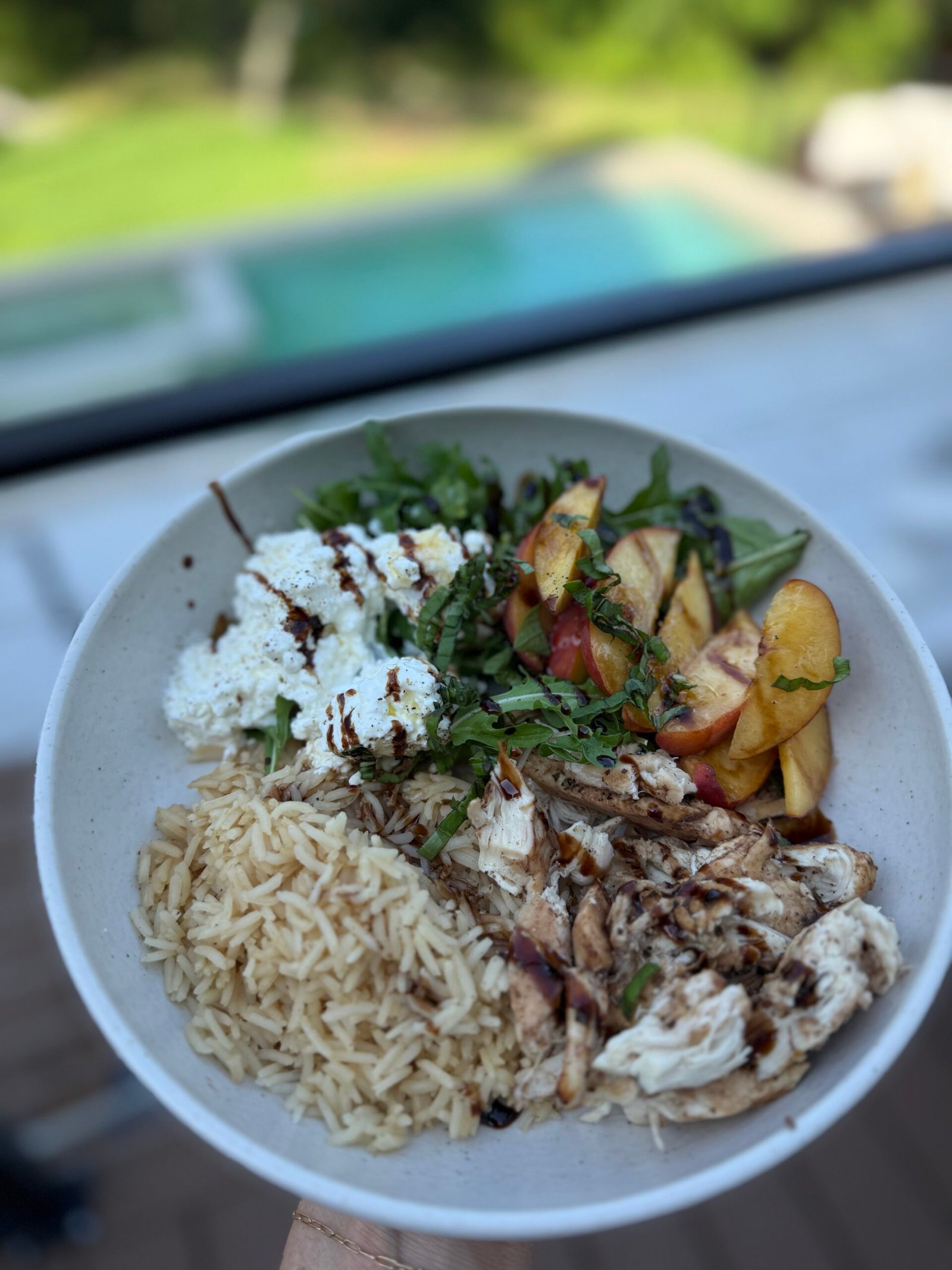 It’s packed with 35+ grams of protein, made with cottage cheese, juicy balsamic chicken tenders, and warm peaches caramelized in hot honey. Toss it all over fluffy basmati rice with fresh arugula and a squeeze of lime? Game over.