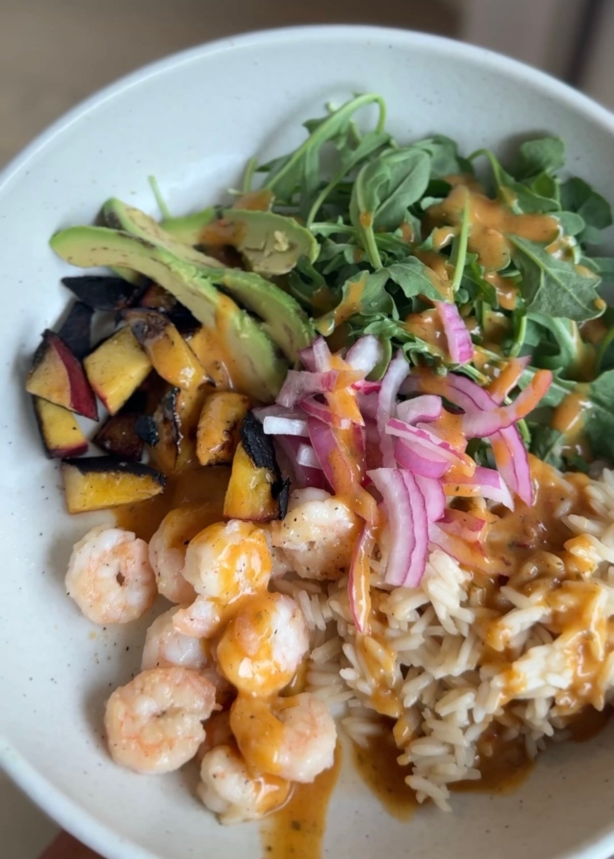 In each bowl, layer jasmine rice and arugula. Top with shrimp, charred peaches, avocado, and pickled onions.