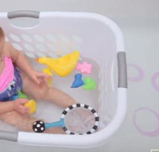Place baby in a laundry basket inside the tub. This keeps them from slipping and contains toys so they’re always within reach.