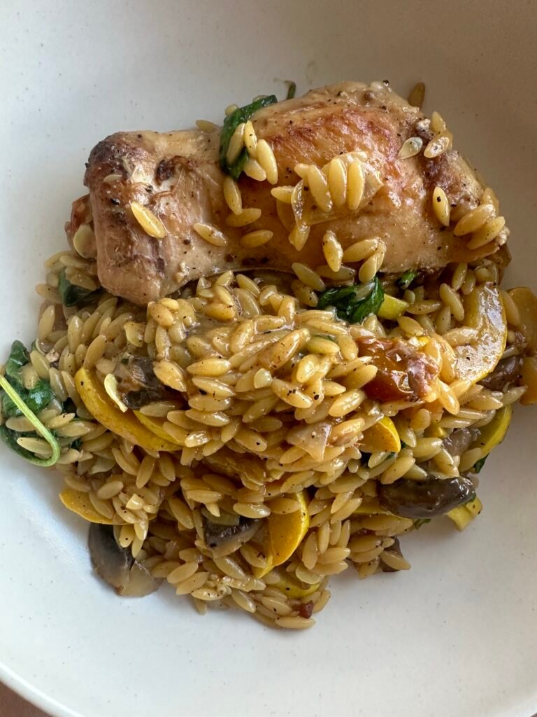 High Protein & Veggie Packed Chicken Orzo Skillet Feel free to use what veggies you have on hand. I did squash, tomato, mushrooms and spinach! Ingredients for 2: - 4 oz organic orzo - 12...
